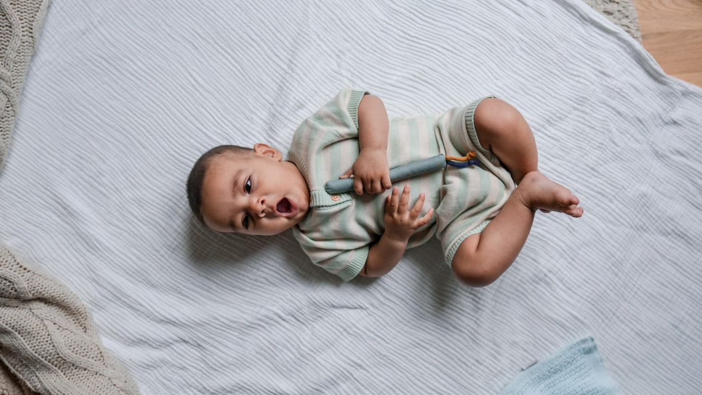 Als erstes wird das Greifen mit Mamas und Papas Fingerchen geübt. Daran adaptiert haben die Schnuckuli Baby Kaustangen einen weiteren Mehrwert und die perfekte Breite um das Greifen zu üben. Babys lieben ihre vielfältigen Schnuckuli Kaustangen! -